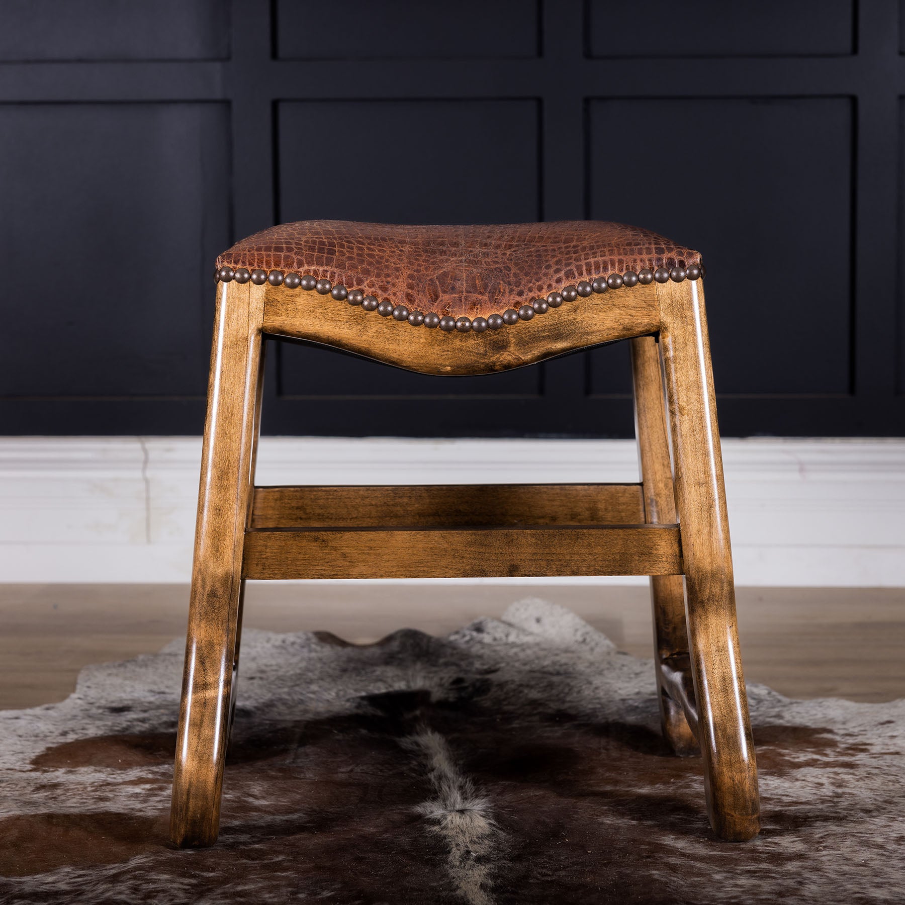 The Moore Leather saddle stool a distinctive piece of furniture inspired by the design elements of traditional Western saddles used in horseback riding. This type of stool brings a rustic and authentic touch to interior spaces, reminiscent of the American Old West. Shown in a 100% top grain croc embossed leather.