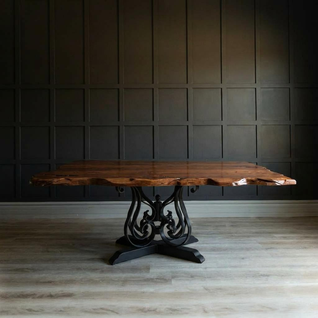 The base is hand-forged from solid wrought iron, offering a bold architectural contrast to the warmth of the wood. Clean lines meet rugged strength, creating a piece that feels both timeless and modern. The iron base can be customized in a variety of finishes and styles to suit your space.